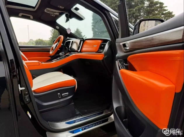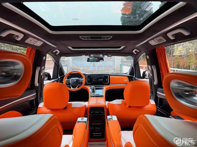 摒弃原车内饰风格,采用爱马仕橙与钢琴白为主色调,打造沉浸式豪华座舱: