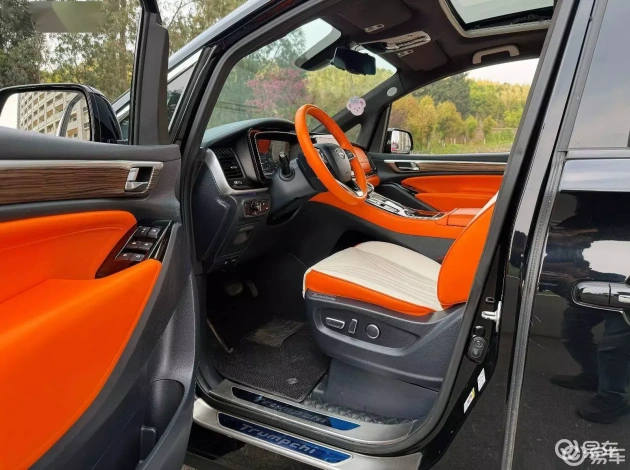 • 座椅功能升级:前排座椅保留橙白拼色设计,优化内部填充材料,提升支撑性和包裹性,并配备通风和加热功能,满足不同季节的需求。后排座椅升级为更宽大的商务座椅,具备电动调节和腿托伸展功能,乘客可随意调整至最舒适的坐姿,仿佛置身于私人豪华会所。