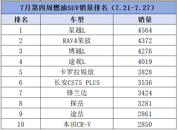 日前,知嘹汽车从中国乘联会获取到了2025年7月份第4周燃油SUV车型销量排行榜。根据公布的榜单来看,燃油SUV市场整体表现强劲,超30款车型周销量突破千辆。其中,作为国产车型的代表,吉利星越L再次夺得单周销量榜冠军。而紧随其后的丰田RAV4荣放和吉利博越L,则分别位列榜单第二、三名。