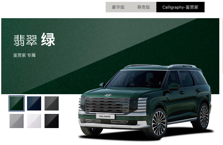全新现代帕里斯帝共推出六种外观颜色,全系可选星海蓝、赛博灰、流光银、水晶白、幻影黑配色,Calligraphy-鉴赏家车型额外提供翡翠绿配色。