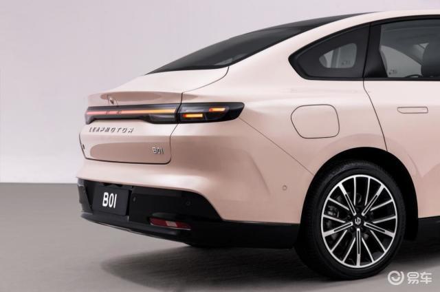 我比较喜欢零跑B01的侧面,轿跑式的车身姿态搭配掀背式后备箱盖、微微翘起的鸭尾尾翼,实现0.197Cd超低风阻系数,而且还有摩根粉的车漆,对于女性用户也很有吸引力。