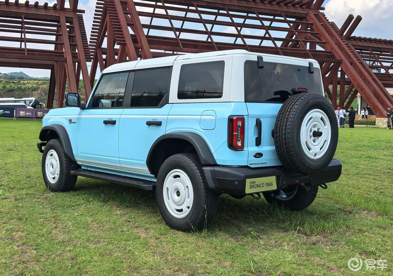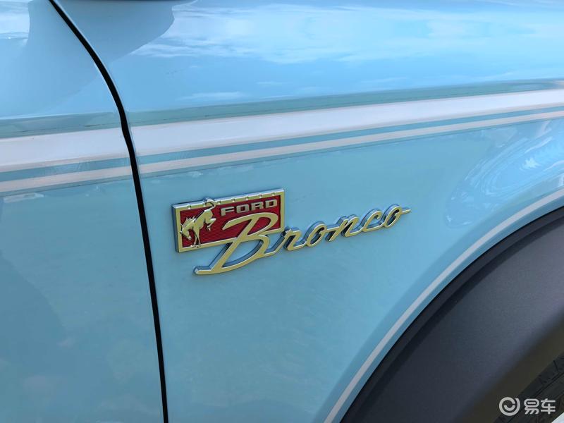 车身侧面,白色细条纹拉花沿袭历史轮廓,从轮拱延伸至车门,既强化了烈马标志性的肩线,又以现代笔触赋予其流动感。为复刻经典传奇,设计师在前翼子板两侧镶嵌了原版斜体镀铬“BRONCO”3D徽标,搭配白色复古盘式轮毂。尾部方面,新车整体设计基本延续在售车型,依然配备了外挂式备胎,尾门同样为侧开方式。