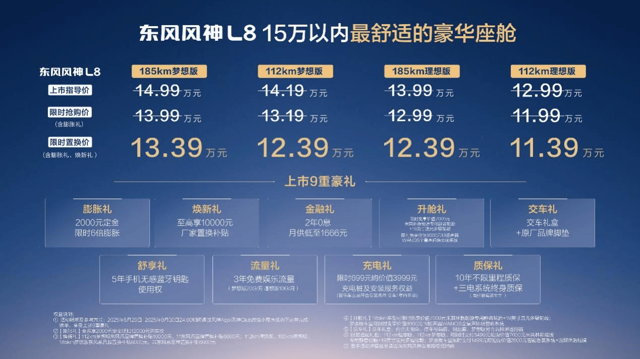 8月29日,在第28届成都车展上,东风风神正式推出东风风神L8。新车限时置换价仅11.39万元起(可叠加享受国/地补)。看来这次成都车展神仙打架,风神不仅在产品力上放手一搏,上市价格更是放手一搏。