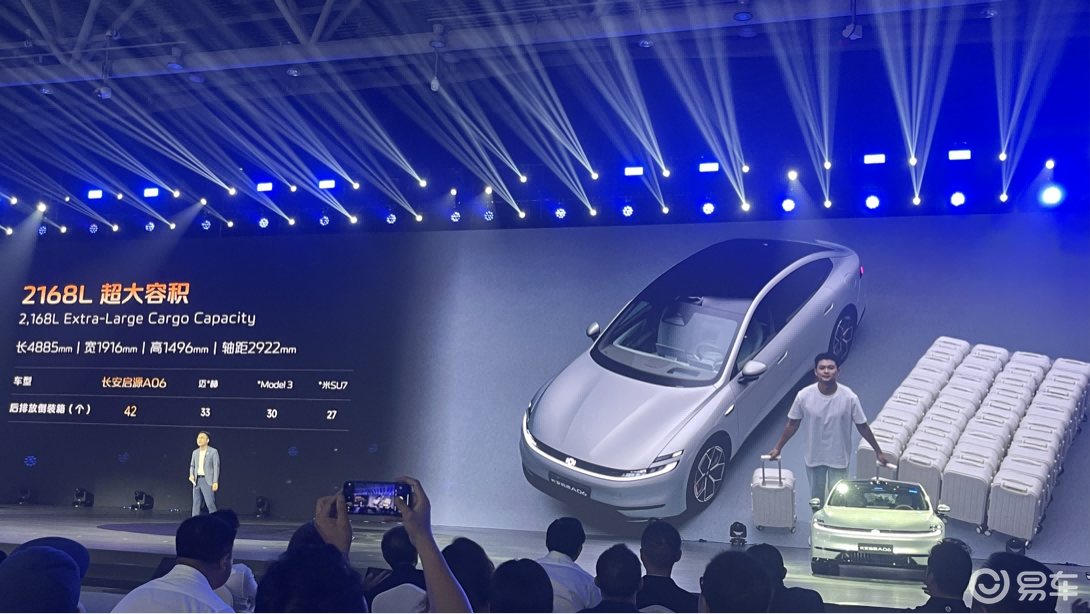 最让小编印象深刻的,则是A06的得房率是达到了惊人的90%,车内空间2168L,它足以容纳42个20寸的行李箱,前后备厢总共764L,而且均支持“拍一拍”车辆前后标识开启,增加了使用的便利性。