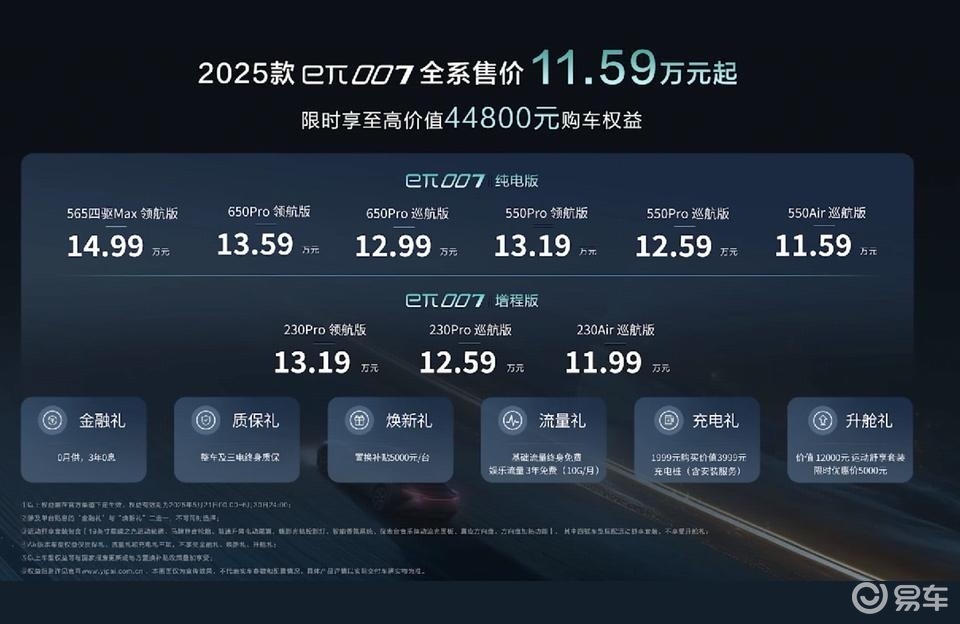 2025款eπ007提供纯电和增程两种动力选择,纯电四驱版拥有400kW的峰值功率,零百3.7秒,动力更加强劲;纯电650Pro版CLTC工况下的纯电续航为650km,续航里程更长。增程版本在CLTC工况下的纯电续航为230km,综合续航可以达到1230km,短途用电长途用油,在解决我们里程焦虑的问题的基础上,还降低了我们的用车成本。
