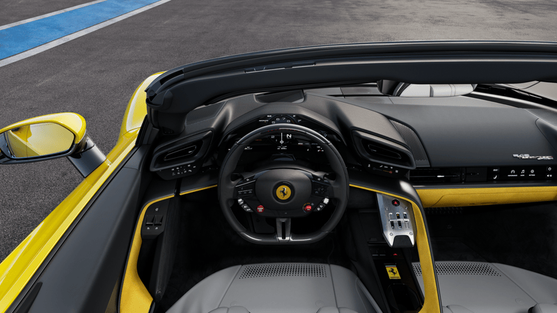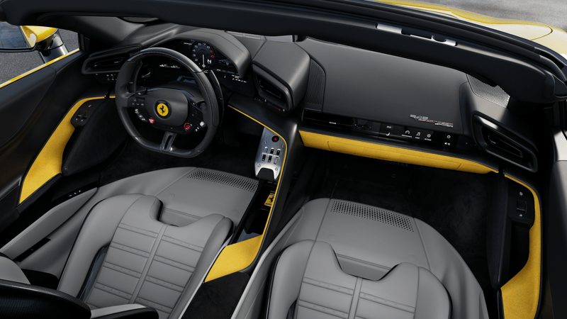 内饰方面,法拉利849 Testarossa Spider在法拉利Berlinetta车型结构布局的基础上,融合了单座赛车所采用的水平仪表盘和座舱设计。仪表盘上方,铝质边框勾勒出字母C形出风口,营造出悬浮的视觉效果。仪表盘上下部分由一条对比鲜明的水平饰带衔接,该区域整合了主要控制按键与副驾驶显示屏。仪表盘下部两个极具建筑美感的帆形结构元素巧妙整合了一系列控制功能,其中位于方向盘侧的帆形构件采用悬浮式设计,并集成了源自法拉利F80的换挡机构。