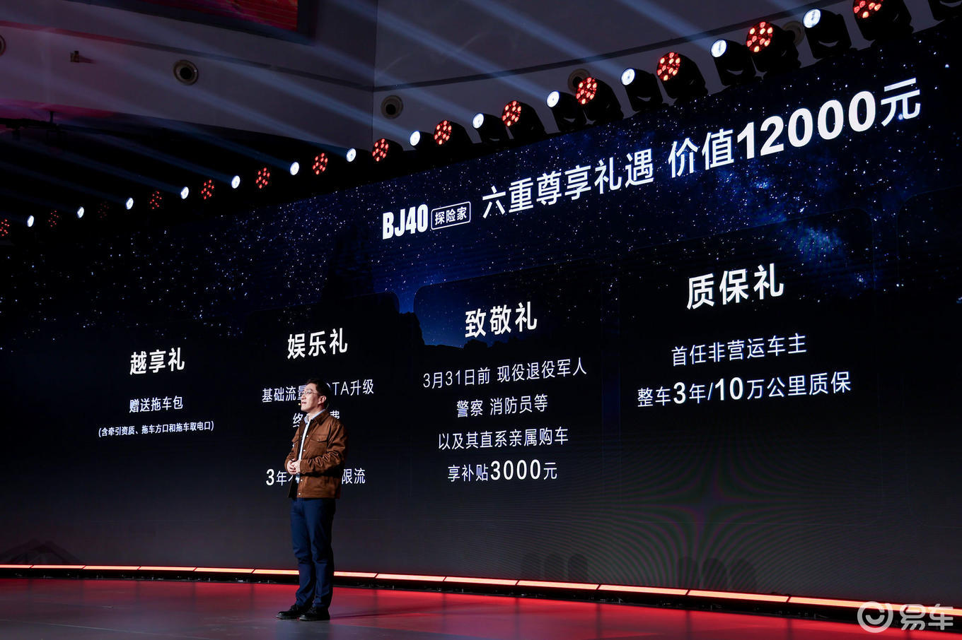 发布会现场,北京越野还公布了多重购车礼遇,包括赠送拖车包(含牵引资质、拖车方口和拖车取电口);基础流量及OTA升级终身免费,娱乐流量3年不限量、不限流;首任非营运车主,整车3年/10万公里质保、首次基础保养免费、享3年免费道路救援服务等。