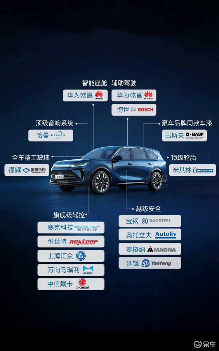 值得一提的是,宝骏华境 S 的供应链矩阵已正式曝光,轮胎搭载米其林、音响系统配备哈曼、车漆采用巴斯夫等一众大牌,在此就不逐一罗列,各位小伙伴看图即可。