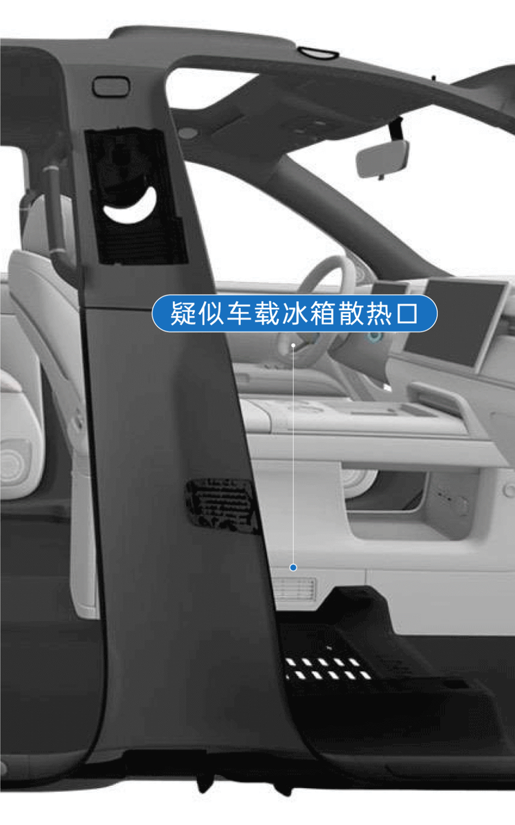 从此前曝光的专利图可看到,宝骏华境 S 在中控台下方配备疑似散热口。通过这个推测,宝骏华境 S 或将配备车载冰箱。