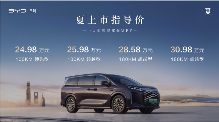 1月8日,比亚迪宣布全新MPV夏正式上市,共有4款配置,分为CLTC工况续航100km/180km,2种纯电续航版本。并提供4种外观颜色及2种内饰配色可选,售价为24.98—30.98万元。