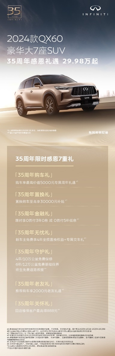 此外,英菲尼迪还特别推出35周年感恩回馈大礼包:购买2024款QX60臻享感恩7重礼,29.98万起即可拥有豪华大7座;购买英菲尼迪QX50尊享感恩5重礼,叠加置换补贴2万元,最低只需19.98万即可拥有动感豪华SUV。以超值价格和诚意礼遇,助力用户轻松购车、无忧用车。