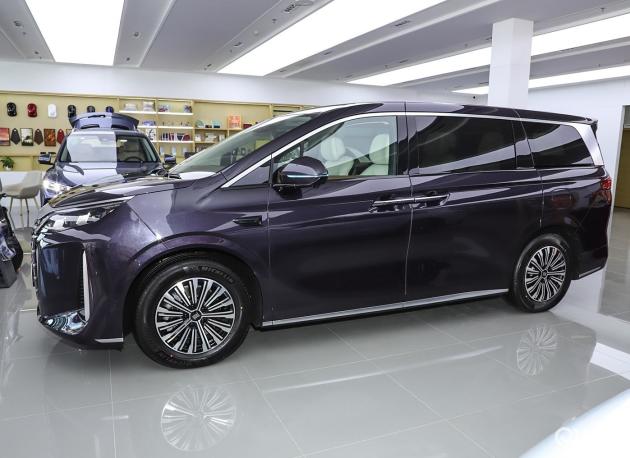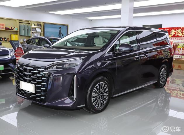 我们首先来看新车的外观设计方面,新车的车头整体采用了全新的家族式造型设计,机盖部分两端有着内凹明显的造型设计,大灯组的面积很大且整体为熏黑的配色设计,内部还有着清晰的可见的透镜光源,中央则是宽厚的金属色饰条连接,增加了车头整体的视觉宽度,下方大面积的中网一直延伸至保险杠底部,内部熏黑的格栅以及密集的镀铬饰条的镶嵌,看起来造型与腾势D9以及丰田埃尔法的造型很相似,所以辨识度也还是不错的,保险杠两侧则是大面积且内凹的熏黑导流口设计,运动感表现出众。
