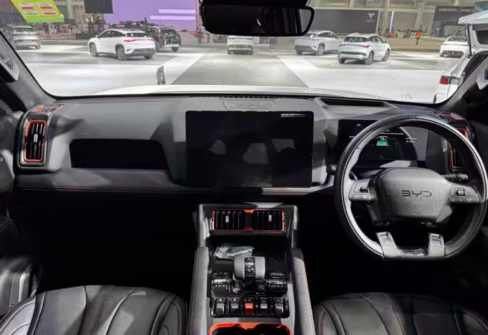 内饰方面,比亚迪SHARK延续了外观硬朗基调,整体黑色内饰,融入大量科技与时尚元素,加以少量橙色点缀,诚稳中带点温馨。悬浮式10.25英寸液晶仪表和12.8英寸可旋转中控大屏,为驾驶者带来便捷智能的操作体验。全新四幅式方向盘握感舒适,多功能按键布局合理。此外,车内还配备12英寸HUD抬头显示屏、手机无线充电面板 、主驾驶席6向电动调节以及座椅加热和通风等功能,并支持手机远程控制、6个安全气囊以及L2级辅助驾驶系统。