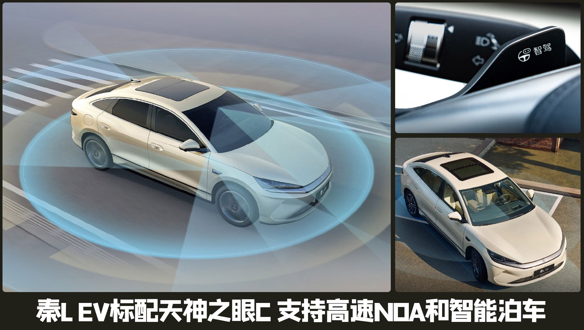 秦L EV全系标配天神之眼C-高阶智驾三目版(DiPilot 100),前风挡内配备三目前视摄像头,共12个车外摄像头+12个超声波雷达+5个毫米波雷达,搭载英伟达Orin N芯片(算力84TOPS),支持高快领航(HNOA)、智能泊车等高阶智驾功能。