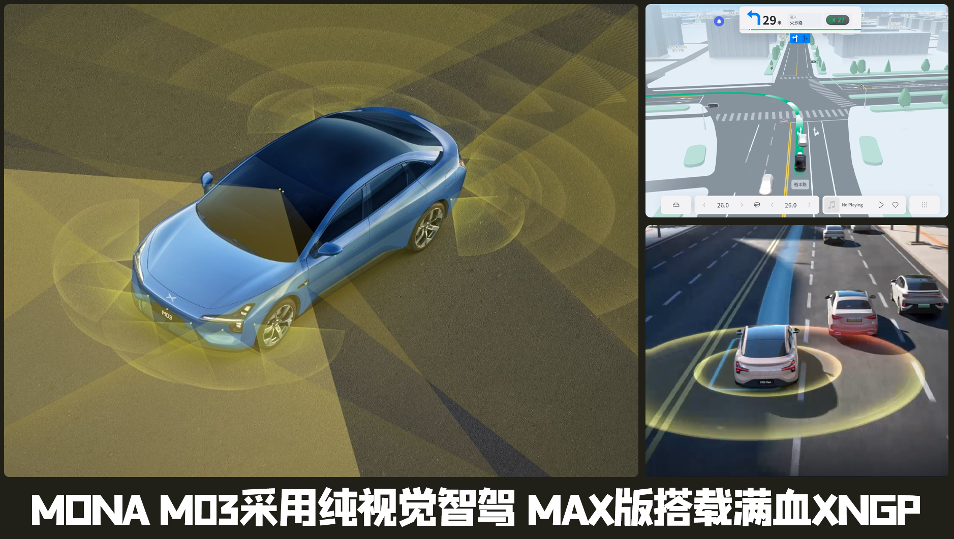 小鹏MONA M03 Max版搭载的是小鹏XNGP,采用纯视觉智驾方案,配备2个毫米波雷达+12个超声波雷达+7个摄像头,搭载两颗英伟达Drive Orin芯片,支持城市NGP、高速NGP、全场景智能泊车等高阶智驾功能。不过,小鹏MONA M03 Max版需要等到今年5月正式交付,其他车型均配备入门版本的XPILOT智驾系统,提供自适应巡航、车道保持辅助、自动紧急制动等基础智驾功能。