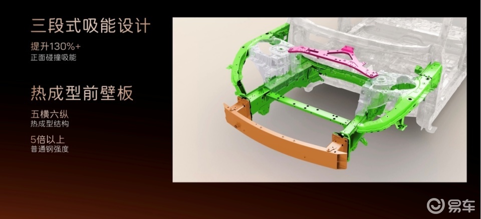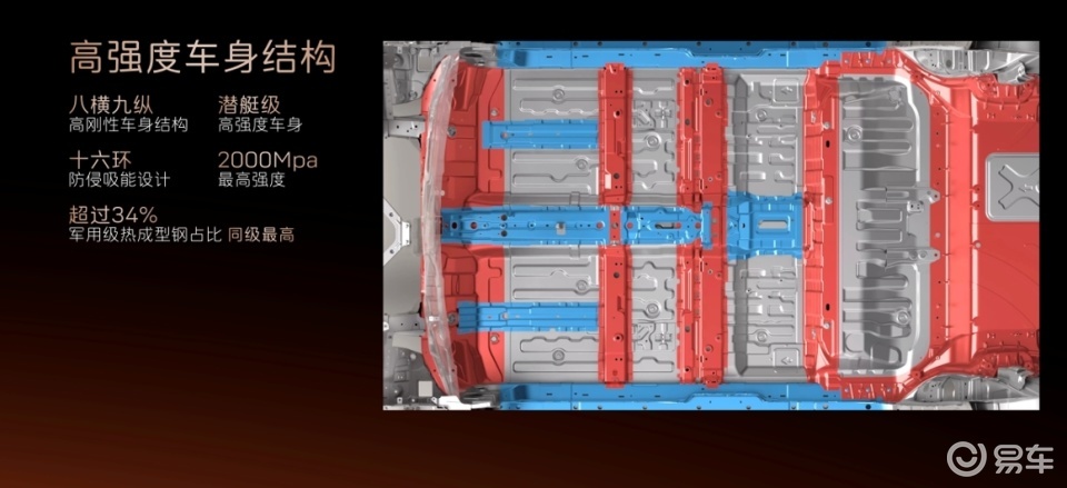 电池安全方面,电芯采用宁德时代AI 加强的第八代智能产线,累计通过150+项专项安全和性能试验,电池0起火0爆炸,达到了极高安全标准。此外,门槛梁采用全贯穿式六宫格铝型材和热成型钢三层外中内板组合设计,形成“三明治”式防护结构,外加热成型双拼座椅后横梁结构,组成三重防护结构,在遭遇冲击时高效保护电池。