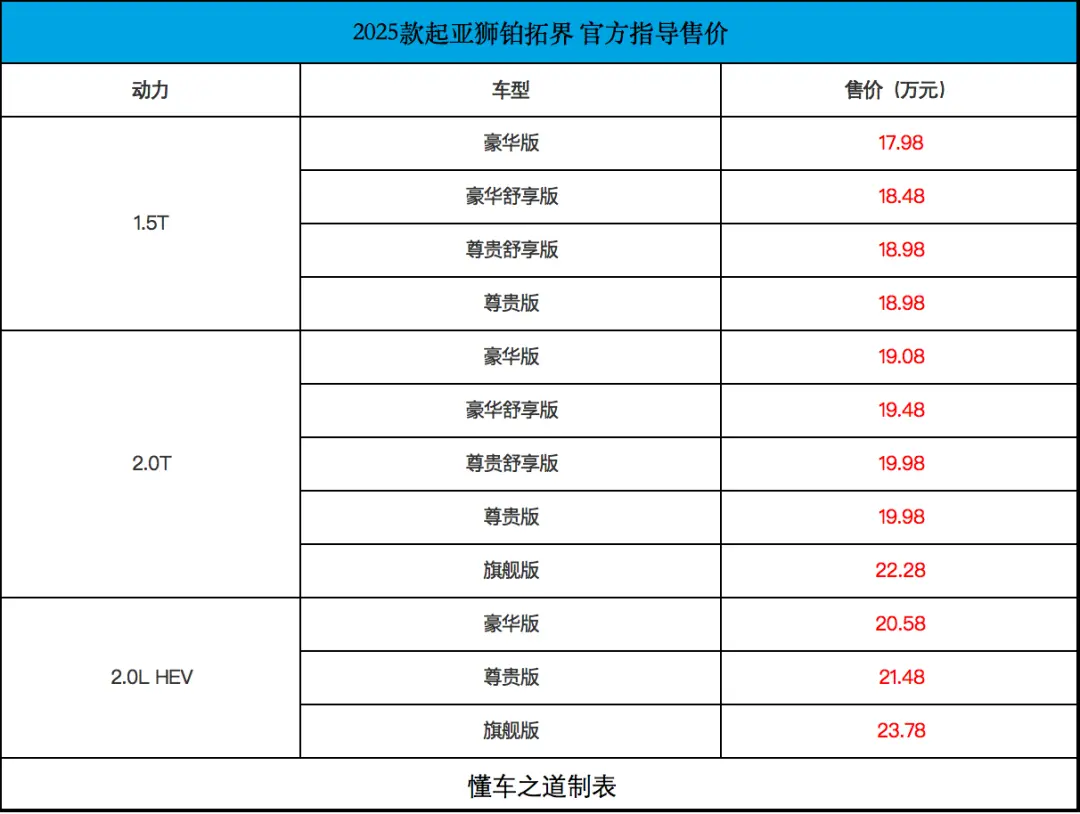 【懂车之道 产品】近日,懂车之道获悉,2025款起亚狮铂拓界正式发布上市,共推出12款车型,售价区间为17.98-23.78万元。下面,和大家一起来看看新车的产品力如何?