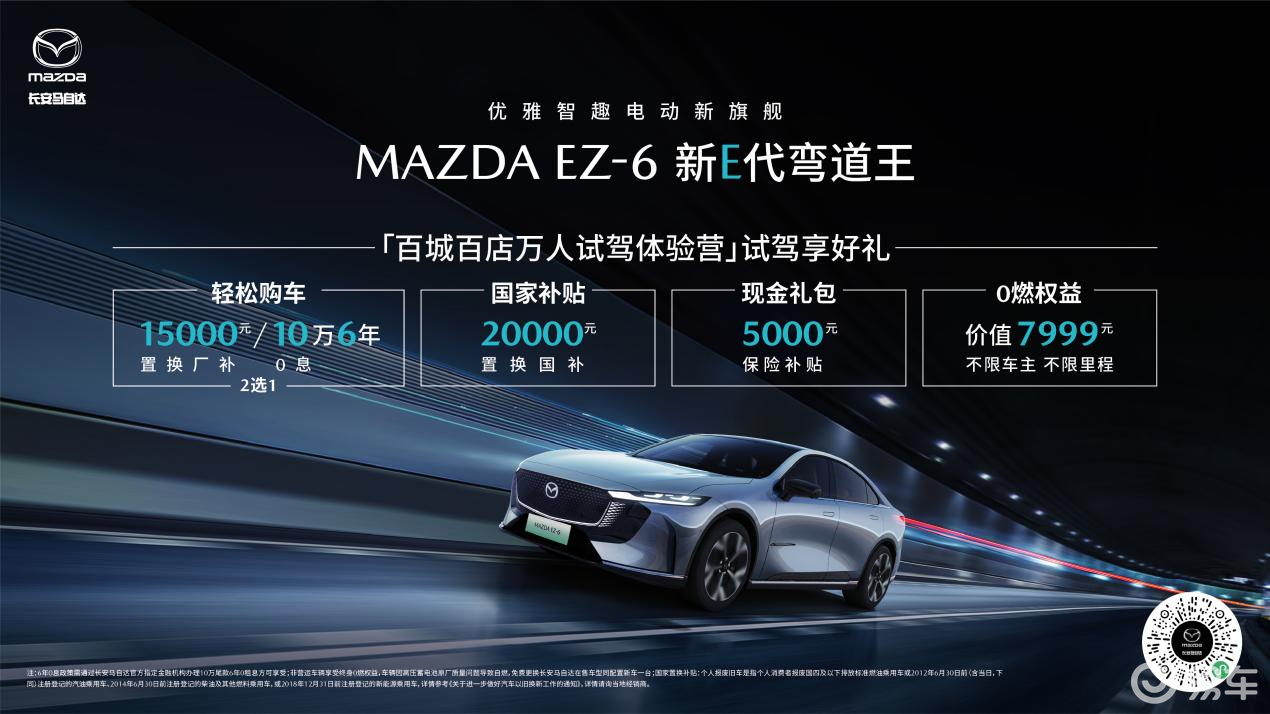 目前,购MAZDA EZ-6可享受至高40,000元补贴(15,000元置换厂补+20,000元置换国补+5,000元保险补贴)、100,000元尾款可享6年0息(和置换厂补二选一),还可享价值7,999元不限车主、不限里程终身零燃权益。