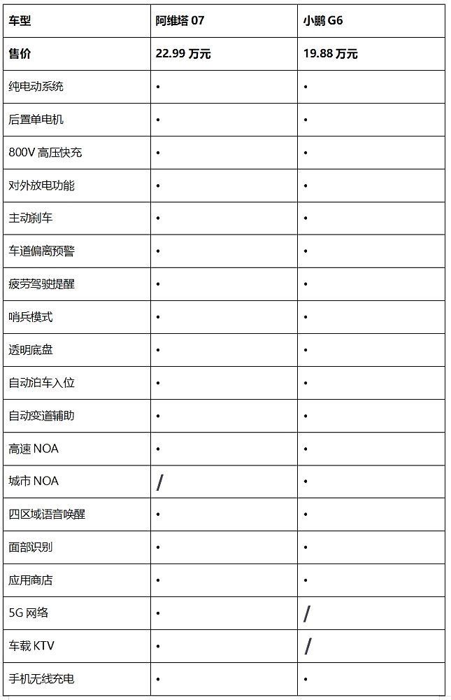 阿维塔07搭载一款最大功率为252kW的后置单电机,CLTC工况下续航里程为650km,同时还支持3.3kW的对外放电功能;而小鹏G6搭载一款最大功率为218kW的后置单电机,以及5C超充AI电池,CLTC工况下续航里程为725km,对外放电功率则达到了6kW。