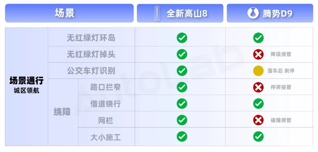但再强也是辅助驾驶,即使成功开对100次路、避免100次碰撞,也不代表每次都能够应对所有路况。两车都出现过接管情况,比如高山8受车流影响无法及时进入左转道,腾势D9右转产生擦碰风险。