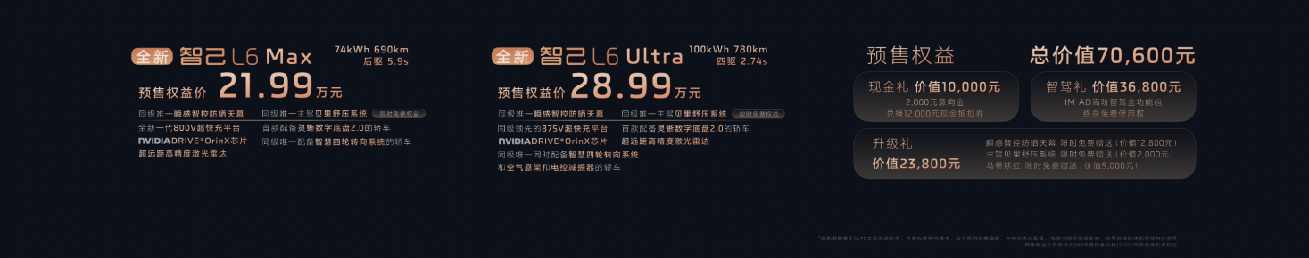 全新智己L6推出三大配置版本,预售权益价格区间为21.99万元~28.99万元。