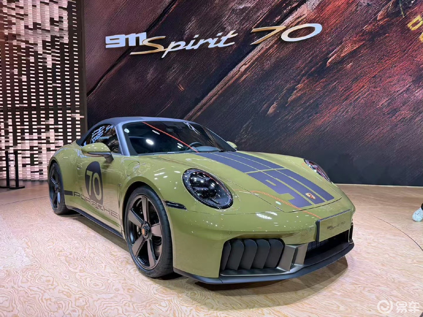保时捷911 Spirit 70基于新款911 Carrera GTS Cabriolet打造,它代表着保时捷历史精神和文化传承的深度绑定。以1,500台的全球限量身份,成为本届车展最受瞩目的藏家级臻品。独家研发的橄榄色NEO车漆,呈现出深邃如复古胶片的墨绿色调,在不同光线角度下折射出金属颗粒的光泽。引擎盖上三条缎光黑条纹复刻了1970年代赛道安全标识文化,既是对保时捷勒芒赛车的致敬,也强化了车身的纵向延伸感。拉长的"911"字样采用哑光黑贴膜工艺,字体比例忠实还原了经典车型的视觉特征。