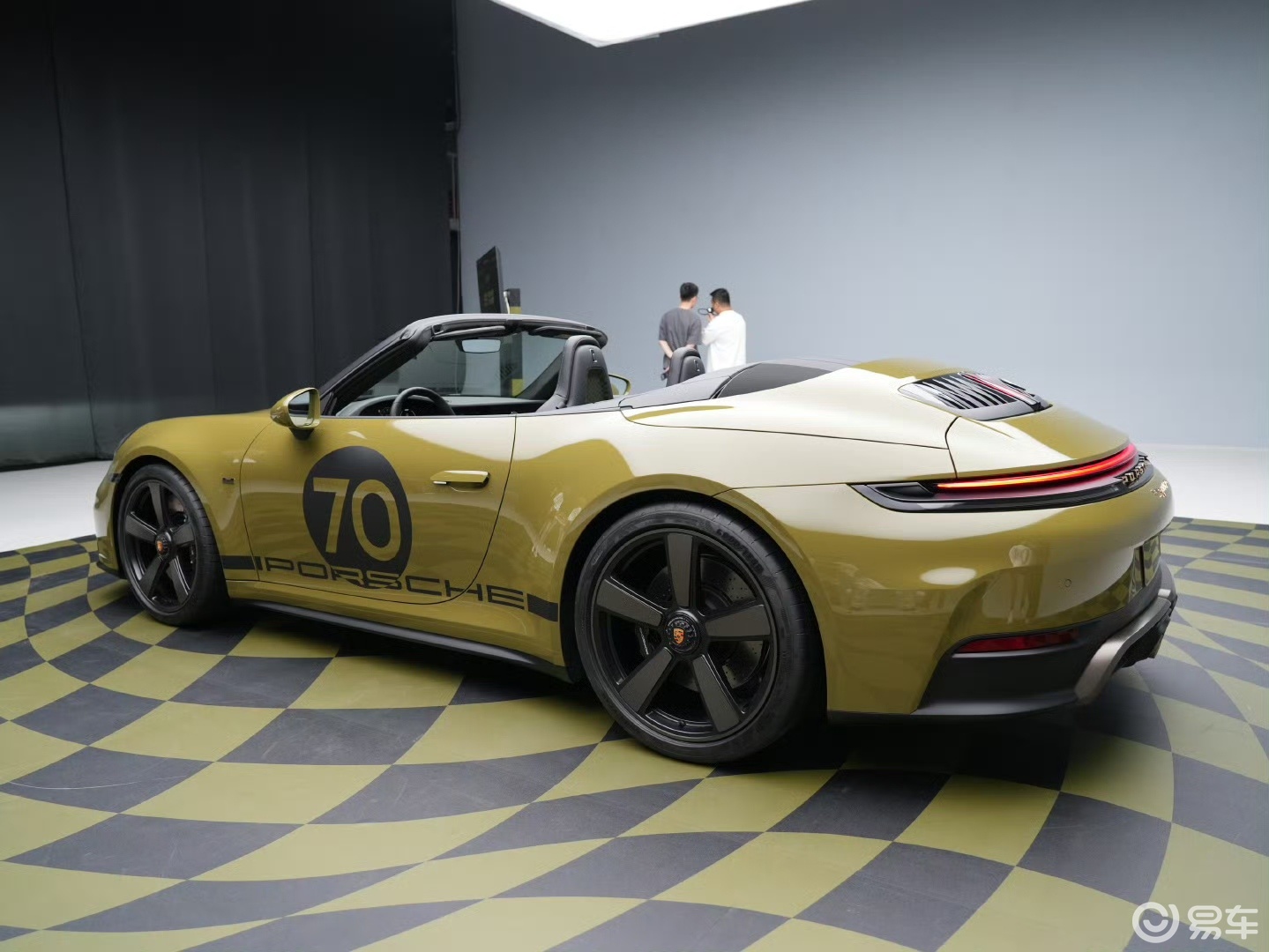 前翼子板处"Porsche Exclusive Manufaktur"金标采用手工镶嵌工艺,与古铜色前唇、后扩散器形成材质呼应。车尾镀金字体设计复刻自保时捷356的十万公里纪念徽章,排气管周围点缀的铆钉装饰暗藏空气动力学优化。黑色软顶篷与同色挡风玻璃框形成视觉连贯性,当顶篷开启时,橄榄色车身与黑色内饰形成的撞色效果更显张力。引擎盖的曲面造型延续初代911的空气动力学基因,后轮拱的肌肉线条则放大了水平对置发动机的机械美感。