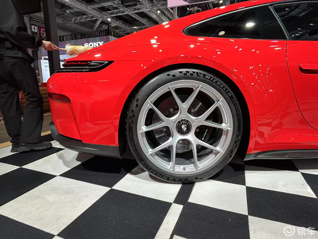 标配20/21英寸Fuchs风格Sport Classic轮毂,采用古铜石色(Bronzite)涂装,辐条造型源自1970年代标志性设计,中央锁止机构则延续了赛车传统。车侧镶嵌圆形赛车号码牌,搭配缎面黑色"Lollipop"棒棒糖标识,再现了保时捷征战勒芒时的经典车身标记。