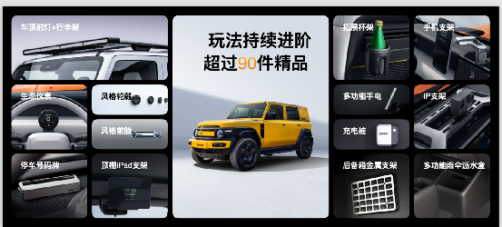 作为一款好玩、好改的“年轻人的大玩具”,iCAR V23原厂预留多处1/4螺丝标准接口,拥有无限的后装拓展潜力,目前已在官方商城累计上架超过90件精品,让V23的可玩性持续进阶。