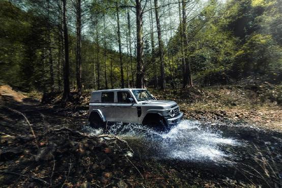 V23方正硬朗的车身轮廓搭配哑光绿车衣,奠定了硬派的基调;复古前格栅在复刻经典造型的同时优化进气设计,提升电机散热效率;机盖射灯严格遵循前大灯规格开发,通过防雾防眩光灯罩强化恶劣天气下的穿透性照明,为越野场景提供可靠保障;车身防擦条选用高韧性材质打造外扩式立体造型,以熏黑工艺提升视觉张力,有效抵御碎石剐蹭与植被摩擦;19吋AT全地形轮胎则通过全宽胎面减震层与强化胎体结构,兼顾复杂路况的抓地力与日常驾驶的舒适性,展现硬核性能与细节美学的平衡。每一项配置都经过严苛的工业验证,确保了改装套件在品质与审美上的双重卓越。