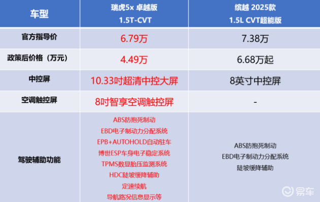 相比之下,缤越配备了8英寸中控屏,屏幕尺寸明显小于瑞虎5x卓越版。在驾驶辅助方面,缤越配备了ABS防抱死制动系统和EBD电子制动力分配系统,但未配备导航路况信息显示和卫星导航系统。因此,在行车过程中,为了确保安全,驾驶者需要更加集中精力留意路况,驾驶压力也相应增加。