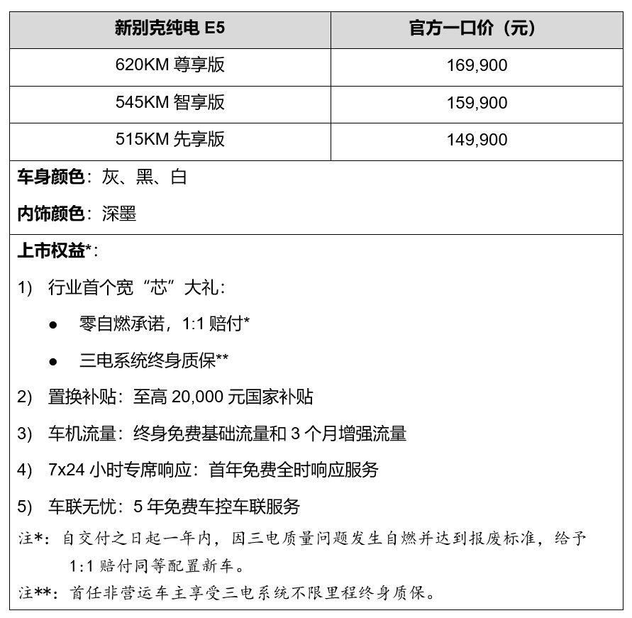 2025年6月19日,别克品牌宣布:越级质享大五座SUV——新别克纯电E5焕新上市,共推出3款车型,官方一口价分别为:620KM尊享版 16.99万元,545KM智享版 15.99万元,515KM先享版 14.99万元;并推出丰厚的上市权益,其中行业首个宽“芯”大礼,包含1:1赔付的“零自燃”承诺,以及三电终身质保等重磅回馈;叠加至高20,000元置换补贴、免费车机流量和车联服务等诚意好礼,让消费者购车用车全无后顾之忧,为油车老司机换购电车带来“大可放宽心”的理想选择。