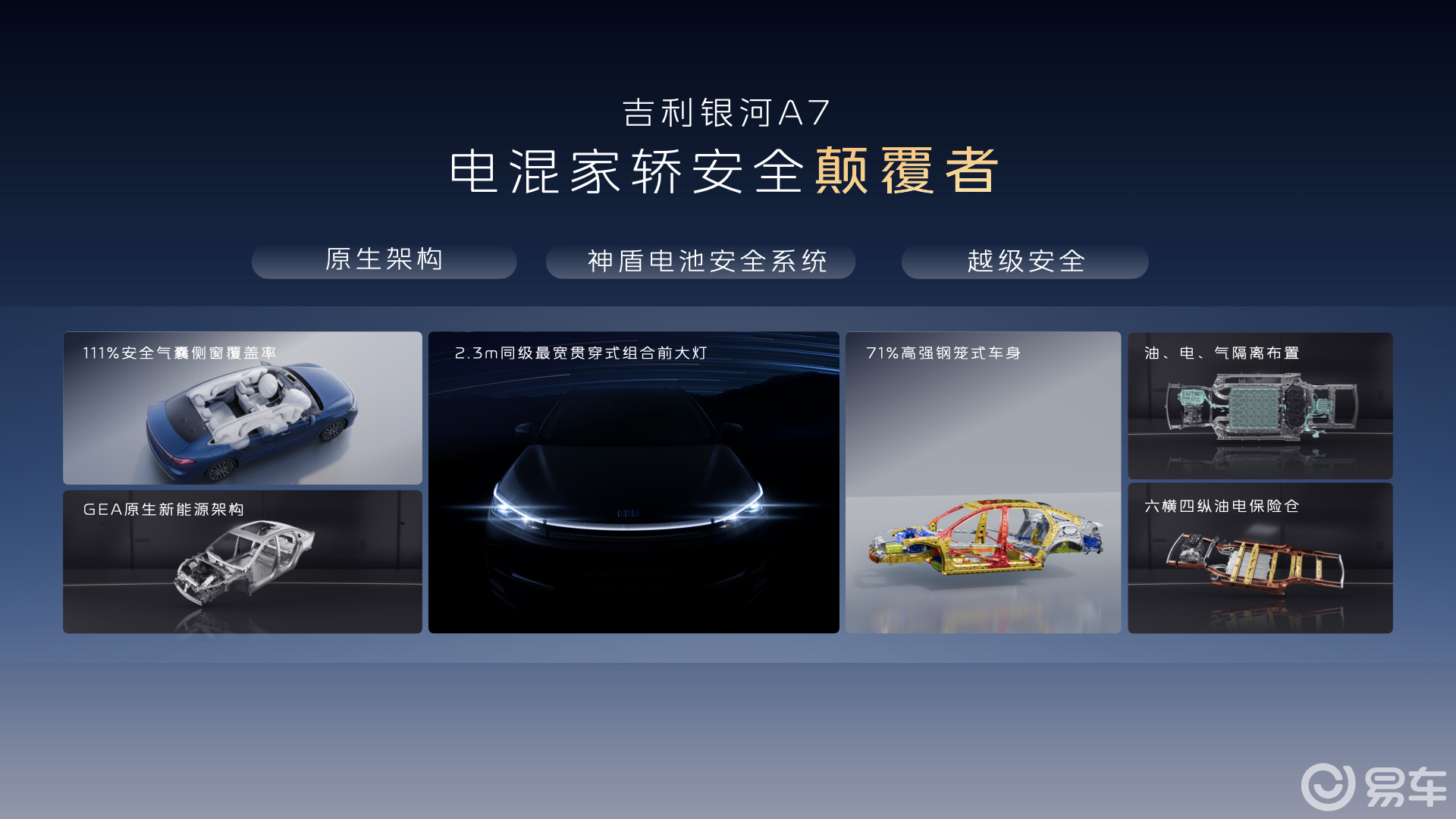 作为首款基于GEA全球智能新能源架构打造的电混轿车,吉利银河A7完整继承了吉利的安全基因,树立全球家轿架构安全新标杆。