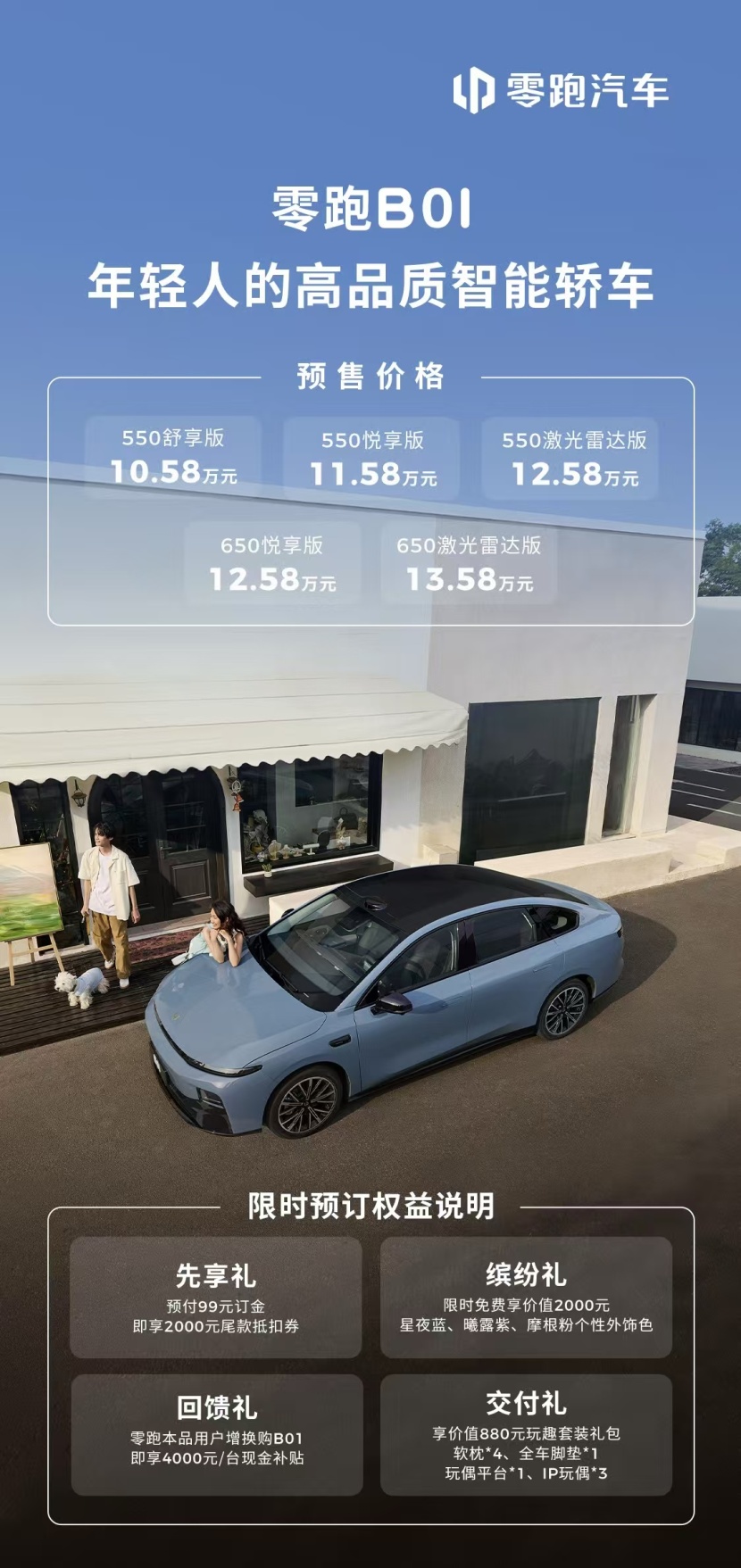 6月29日,零跑汽车官方表示旗下全新纯电紧凑型动轿车—零跑B01正式开启预售。新车共推出5款车型,售价区间为10.58-13.58万元。据悉,新车是零跑B平台下的首款纯电轿车,基于LEAP 3.5电子电气架构打造,将于7月内上市并交付,上市后的最大对手肯定就是小鹏MONA M03了。另外,参考零跑B10的售价来看,它的起售价为9.98万起,一般来说轿车要比SUV便宜,所以最终的价格应该会比B10低。关于新车的相关权益,大家可以直接看下图。