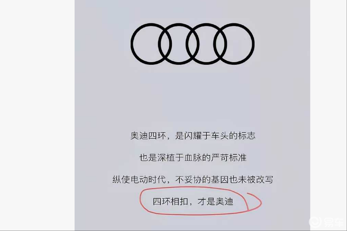 但就是这种合作成果,奥迪E5发布的当天晚上,一汽奥迪发布了一则海报“四环相扣,才是奥迪”,暗指上汽奥迪E5未悬挂四环车标。