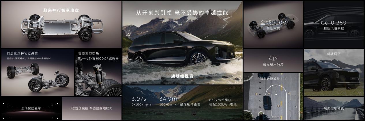 全新 ES8 搭载蔚来最新一代全域 900V 高压架构,标配 102kWh 电池,配合 520kW 前后双电机,峰值扭矩 700N·m,零百加速时间仅需 3.97 秒。全车 122 处空气动力学优化,风阻系数低至 0.259, CLTC 综合续航里程达到 635 公里。