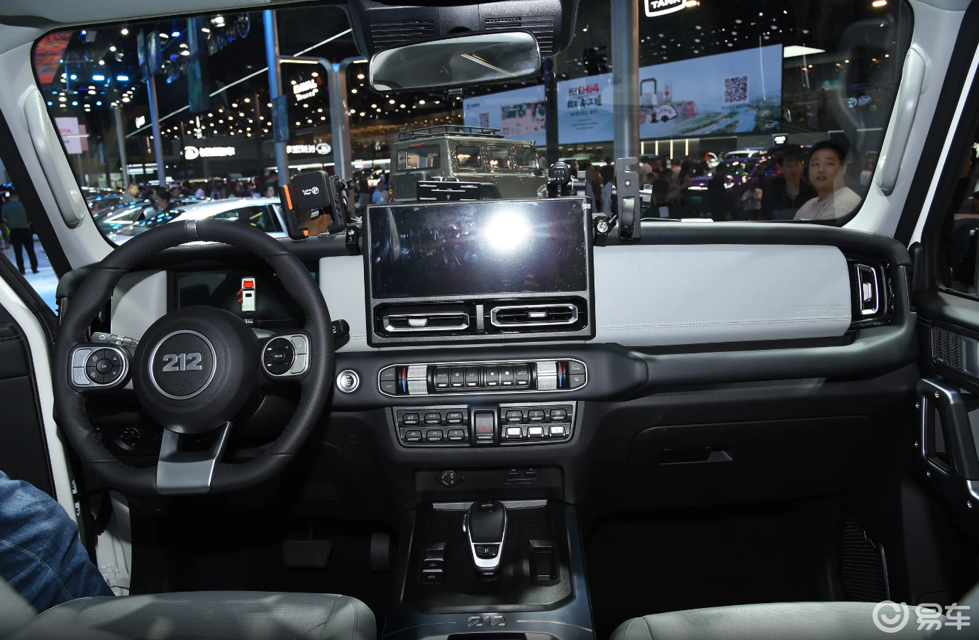 现在内饰相比一些自主品牌的新车型还是有些差距,毕竟科技氛围方面没那么强,但如果相比曾经的北京212,这款212 T01现在至少给你提供了比较舒服的皮革软包大沙发,而且整个台面上也提供有基础的大屏幕,虽然整个车机系统上手操作还是有些老气,但至少基础的智能化需求可以满足。