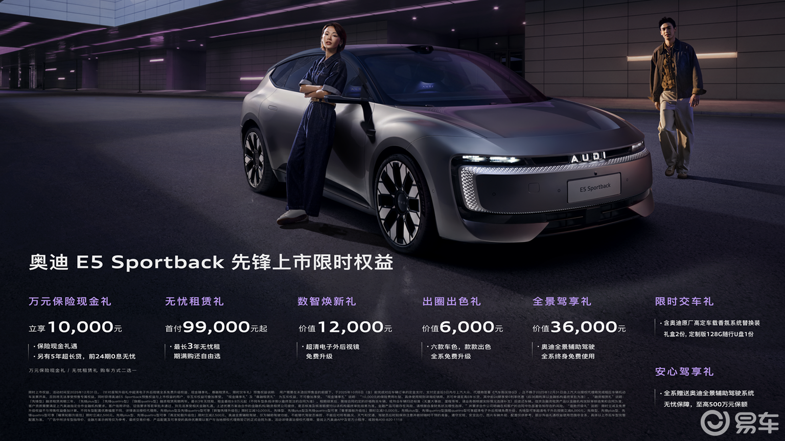 此外,奥迪在定价策略上也显示出强烈的市场意图。22万元的实际起步价,明显低于品牌以往电动产品的价格带,这不仅降低了消费者的入手门槛,也向市场传递出奥迪真正以“中国速度”推进电动化的决心。配合金融方案和用户权益,E5 Sportback在豪华纯电市场中已具备较强的价格竞争力。