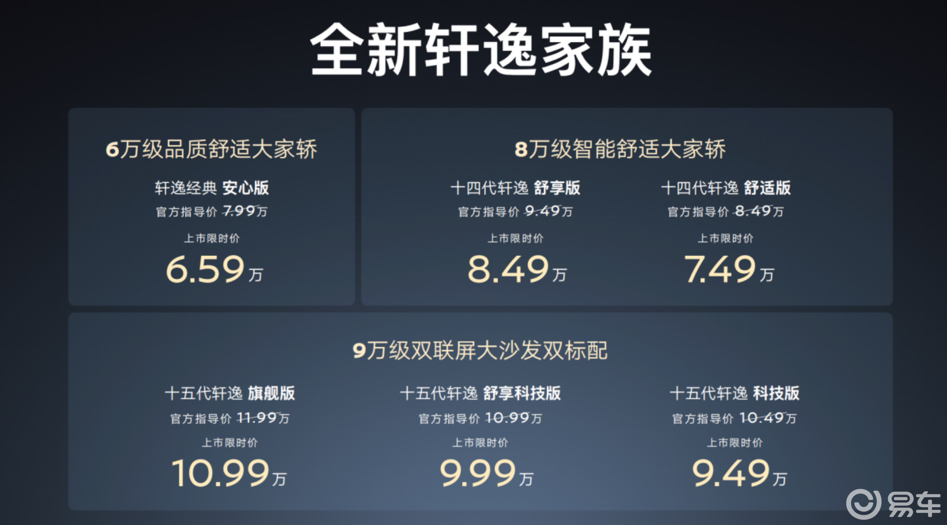 十五代轩逸共推出3款车型,限时价9.49 万—10.99 万元。