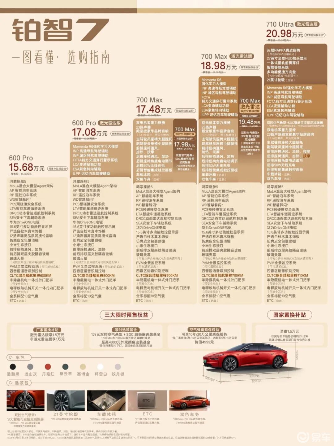 在公布预售价格的同时,铂智7还带来了一系列超值购车权益,包括针对激光雷达版提供1.5万元厂家置换补贴,非激光雷达版提供1万元补贴、1万元空悬选装基金和至高4000元车色选装、限时免费空气弹簧延保(质保10年或30万公里)、全系可享最高1.5万元国家置换补贴等。