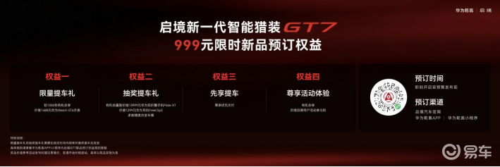 即日起,用户可通过启境汽车官网、华为乾崑APP及小程序参与盲订,享受限量提车礼、优先提车权及后续品牌活动的优先参与资格等多重专属权益 。